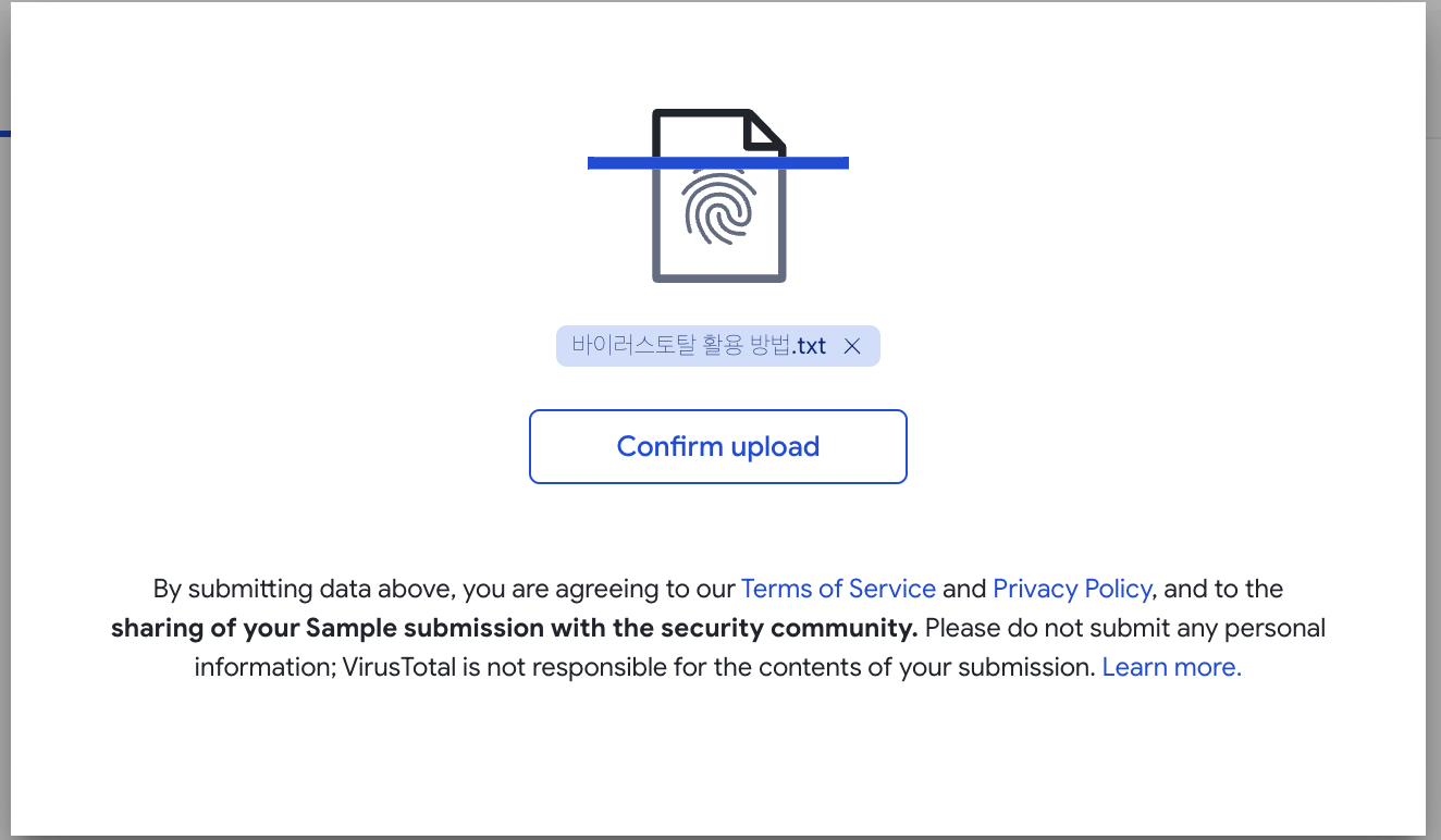 파일을 검사하실 때 주의하실 점은 올려놓으신 파일들은 다른 사람들에게 공유될 수 있다는 겁니다. 예전에 회사 중요 파일을 바이러스토털에 올려 점검했다가 인터넷상에 노출되어서 뉴스에 보도된 적이 있습니다. 이러한 점은 바이러스 토털 이용 시 항상 고려할 부분입니다. 그래서 실무에서는 바이러스 토털 사용 시 실제 파일을 올리기보다는 '해쉬(hash)'라는 파일의 고윳값을 추출해서 점검합니다. 해쉬 추출 법은 추후에 따로 작성하겠습니다.