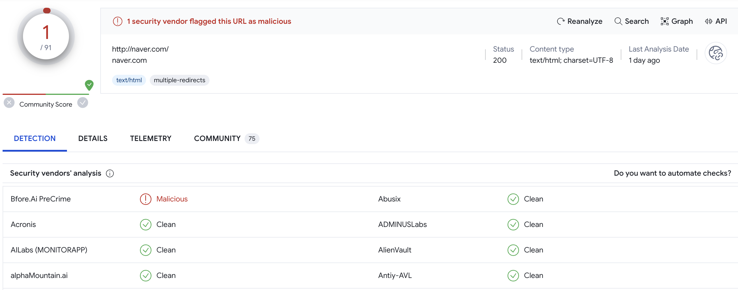 위 그림에서 알 수 있듯이 네이버는 대한민국 사람이라면 정상 사이트인지 모두 알고 있지만 해외에서는 악성으로 판단하는 일부 엔진이 존재합니다. 따라서 바이러스 토탈의 결과를 맹신하기보다는 참고자료 및 분석 자료 정도로 생각하시면 됩니다.